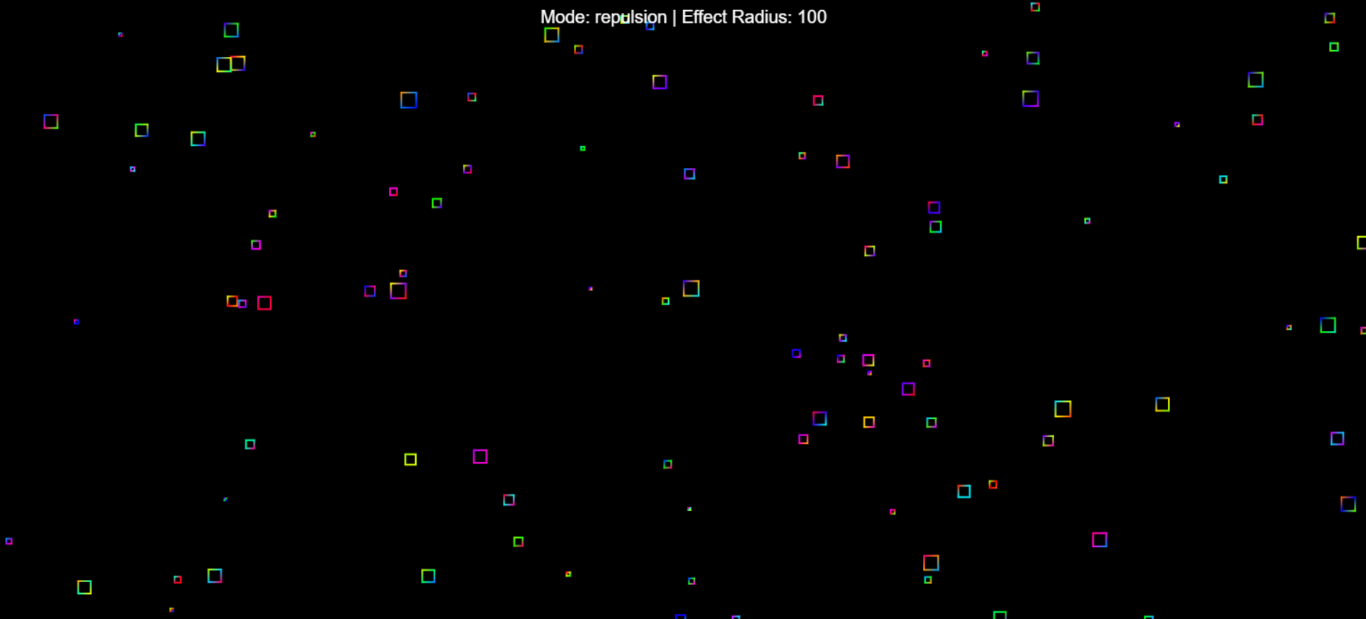 A simple 2 dimensional particle simulation written in JavaScript. Click to change modes and use the up and down arrow keys to change the effect radius. (2024) Check it out here: 2D particles