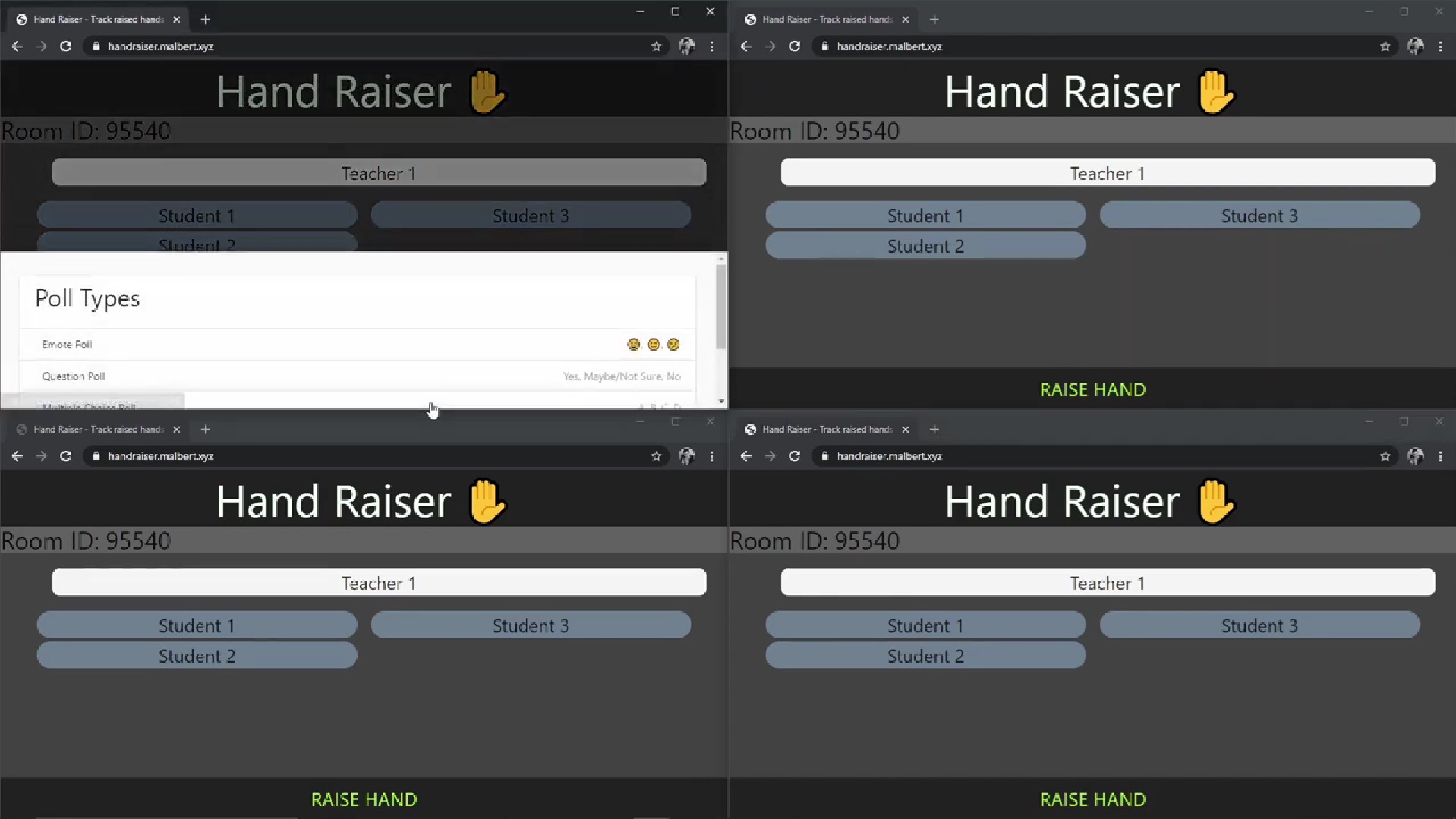 While our classes were temporarily suspended due to COVID-19 in 2020, I worked together with a friend to build this project. The objective is to provide an easy way for teachers to get feedback from students in an online class. Hand Raiser allows individuals to create rooms, have other join it, create quick polls and track whose hand is raised! Check it out here: Handraiser GitHub